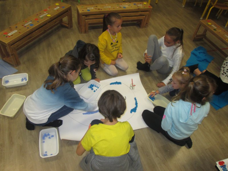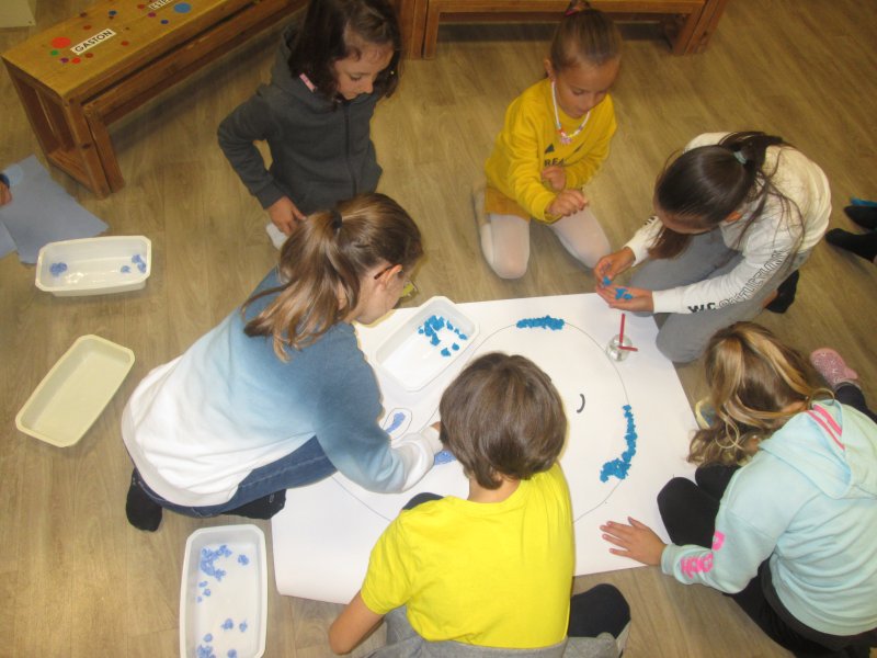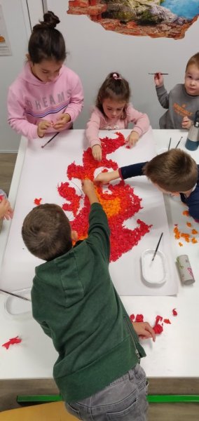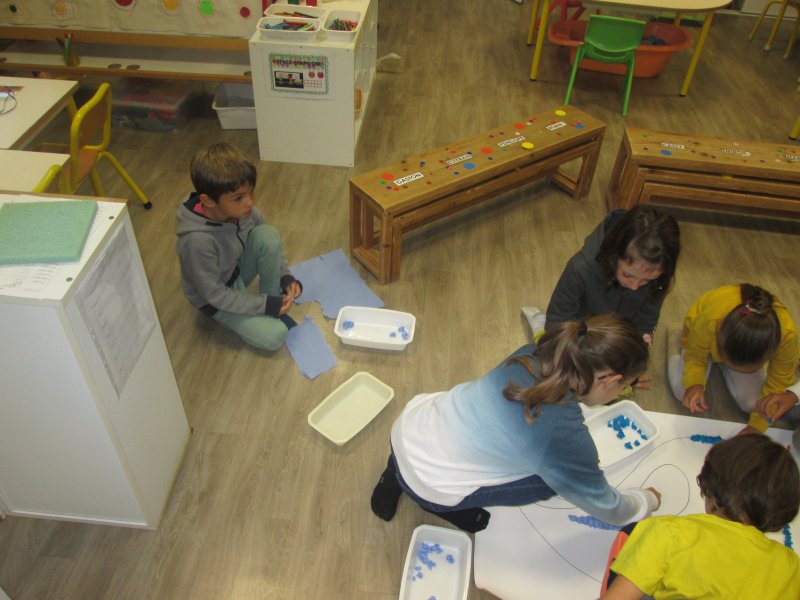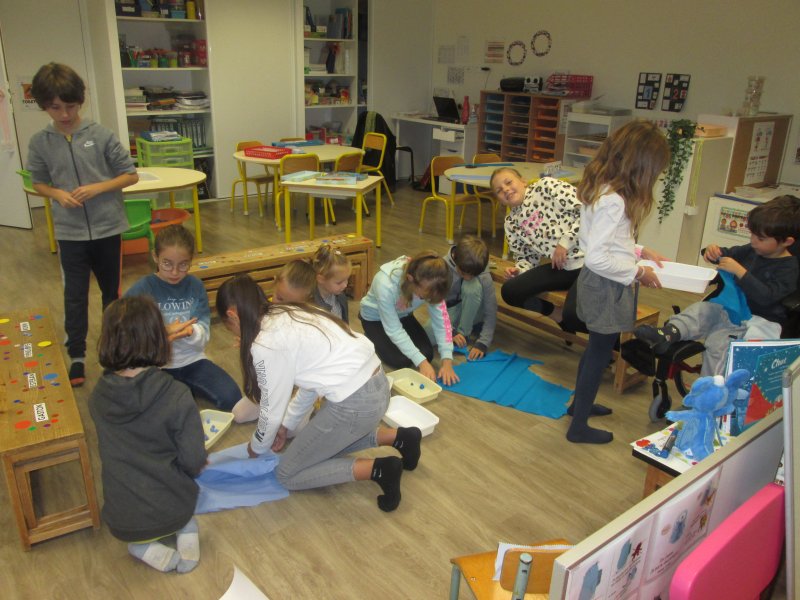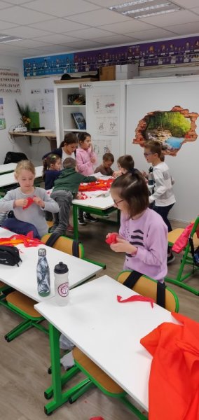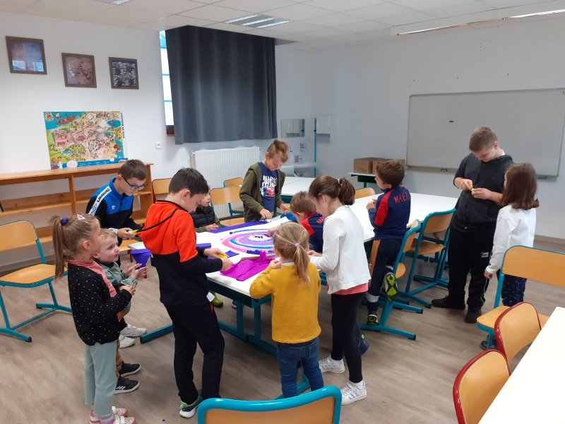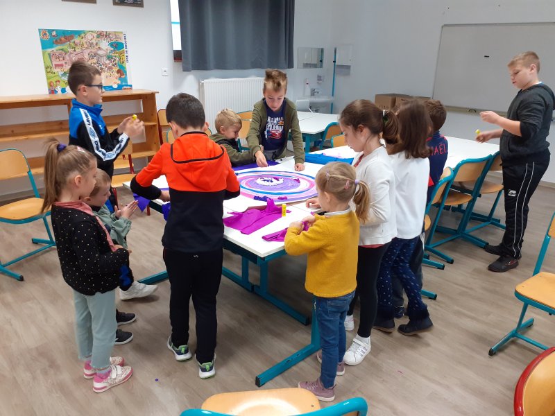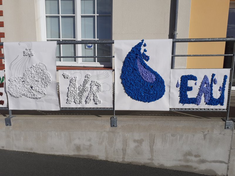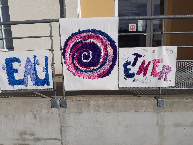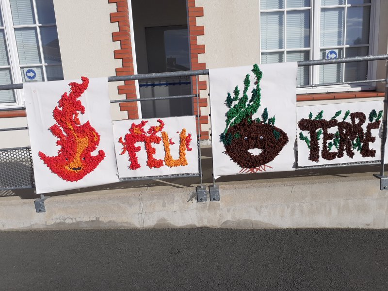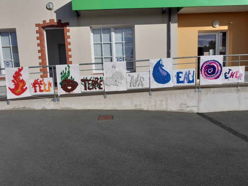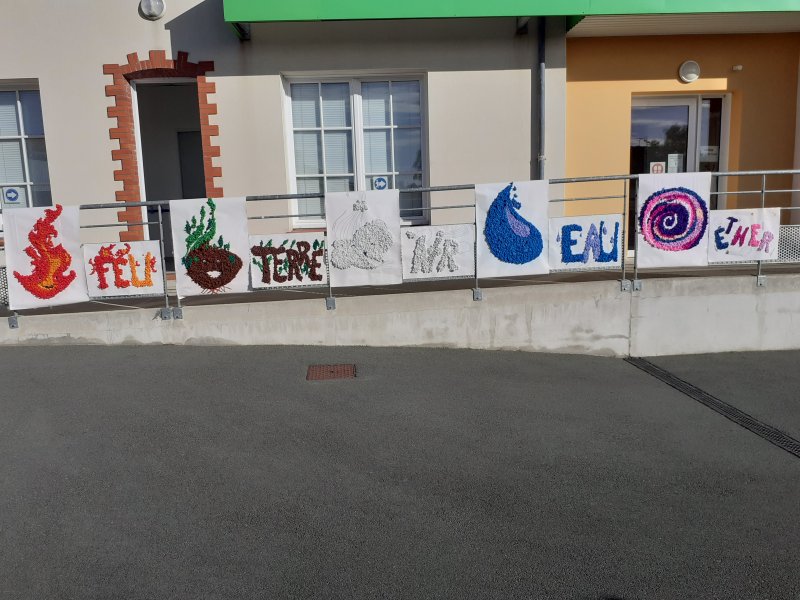 Notre projet sur l’année est d’aborder les 4 éléments de manière transdisciplinaire. Pour l’amorcer, nous avons banalisé une matinée création en mélangeant les élèves des classes (de la PS au CM2) pour travailler les 4 éléments en Arts Plastiques. Nous avons récréé les images des 5 éléments: le feu, la terre, l’eau, l’air et le 5ème élément, l’héter. Nous avons ensuite exposé nos œuvres dans la cour de récréation pour que les parents présents puissent les voir.